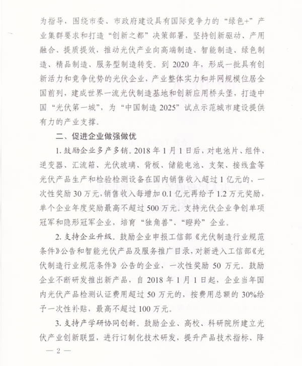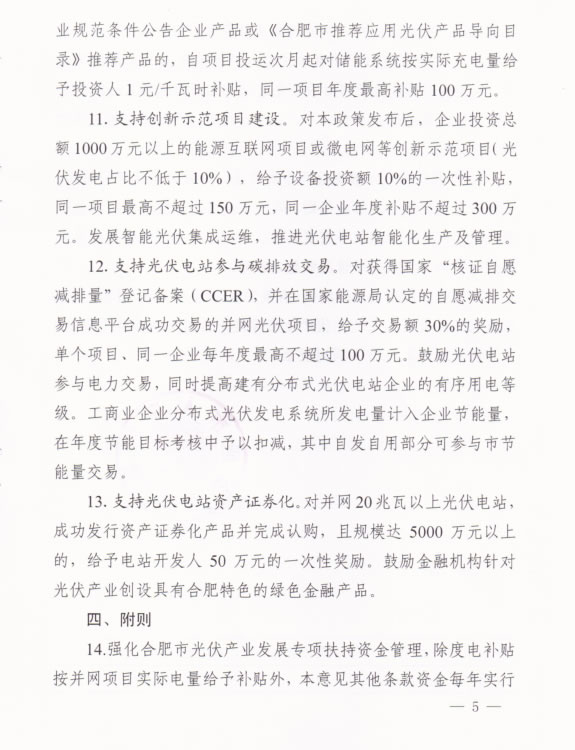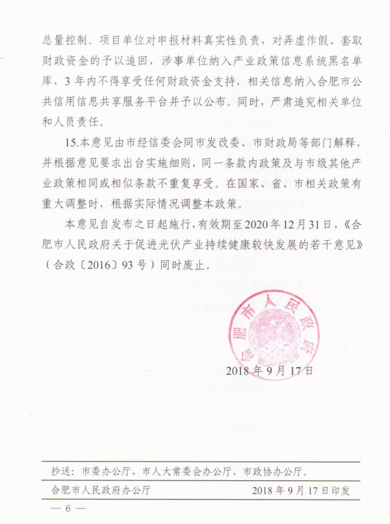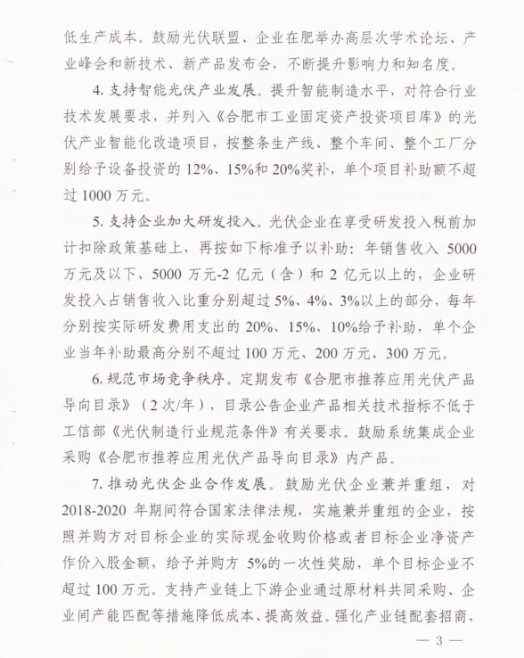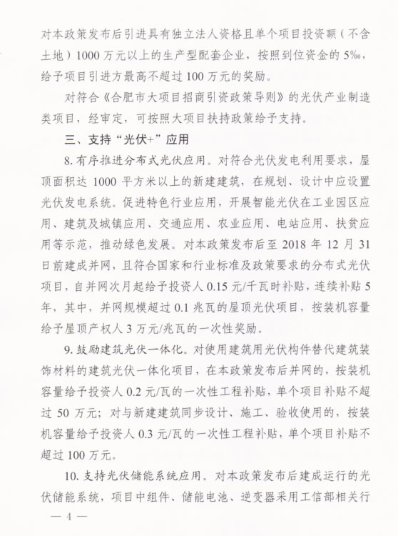 近日,合肥市人民政府关于进一步促进光伏产业持续健康发展的意见指出,对符合光伏发电利用要求,屋顶面积达1000平方米以上的新建建筑,在规划、设计中应设置光伏发电系统。促进特色行业应用,开展智能光伏在工业园区应用、建筑及城镇应用、交通应用、农业应用、电站应用、扶贫应用等示范,推动绿色发展。对本政策发布后至2018年12月31日前建成并网,且符合国家和行业标准及政策要求的分布式光伏项目,自并网次月起给予投资人1.15元/千瓦时补贴,连续补贴5年,其中,并网规模超过0.1兆瓦时的屋顶光伏项目,按装机容量给予屋顶产权人3万元/兆瓦的一次性奖励。