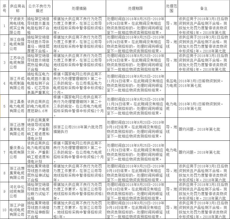 其中第六批3起,处理范围皆为导、地线,由于这3家供应商2018年3月1日后物资到货且产品检测不合格,国网浙江电力按加大处罚力度暂停该类物资中标资格1年。处理时间自2018年9月20日-2019年9月19日结束。在此期间没有相应物资类别招标的,处理时间将顺延至下一批相应物资类别招标结束。