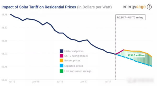 在2017年9月底,美国国际贸易委员会(International Trade Commission)认为美国光伏组件商受到损害后不久,EnergySage发现市场上的户用太阳能价格开始飙升。