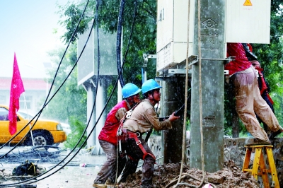 为了快速恢复供电,抢修人员冒雨开展抢修工作。摄影/王丽