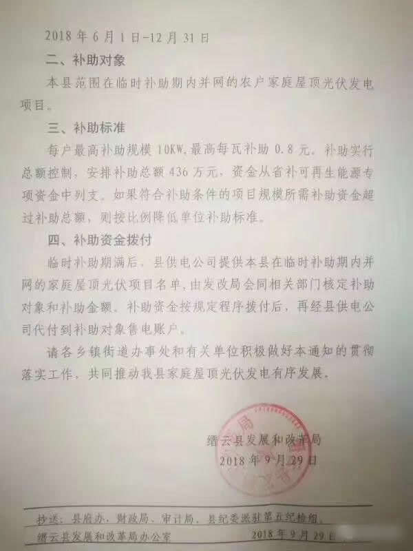 9月29日,缙云县发改局下发了《关于对家庭屋顶光伏发电项目实行临时补助的通知》。对本县范围在2018年6月1日-12月31日期间并网的农户家庭屋顶光伏发电项目实行临时补助