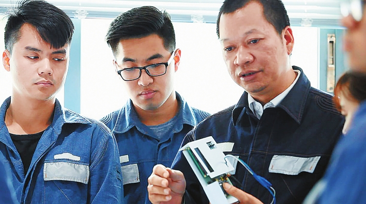 佛山南海供电局里水供电所技能专家张永文在向青年员工分享创新成果。 陈海瑜 摄