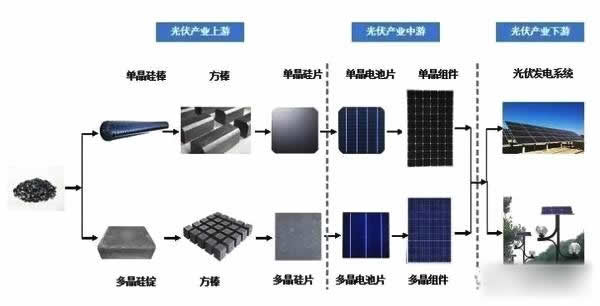 单晶硅组件: 硅料→单晶硅棒→单晶方棒→单晶硅片→单晶电池片→单晶组件