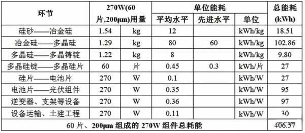 2)组件辅材。以60片多晶硅组件为例,玻璃重量为12.93kg,每吨光伏玻璃耗能350kg标煤,按1kWh等量0.1229kg标煤计算,光伏玻璃耗电为0.142kWh/W,铝边框2.8kg,按每吨耗电1.335万度,铝边框电耗为0.144kWh/ W,组件层压等耗电约为0.06kWh/W。