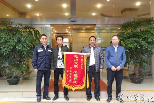 农村电气化网讯:10月17日,播州区平正乡团结村村支部书记王朝海和村民沈开红、沈仕荣将一面写有“电力支农 心系群众”的锦旗送到了播州供电局执行董事、党委书记李飞的手中。感谢播州供电局在助力团结村脱贫攻坚,保障群众用电工作上做出的努力,并与该局领导班子成员召开座谈会。