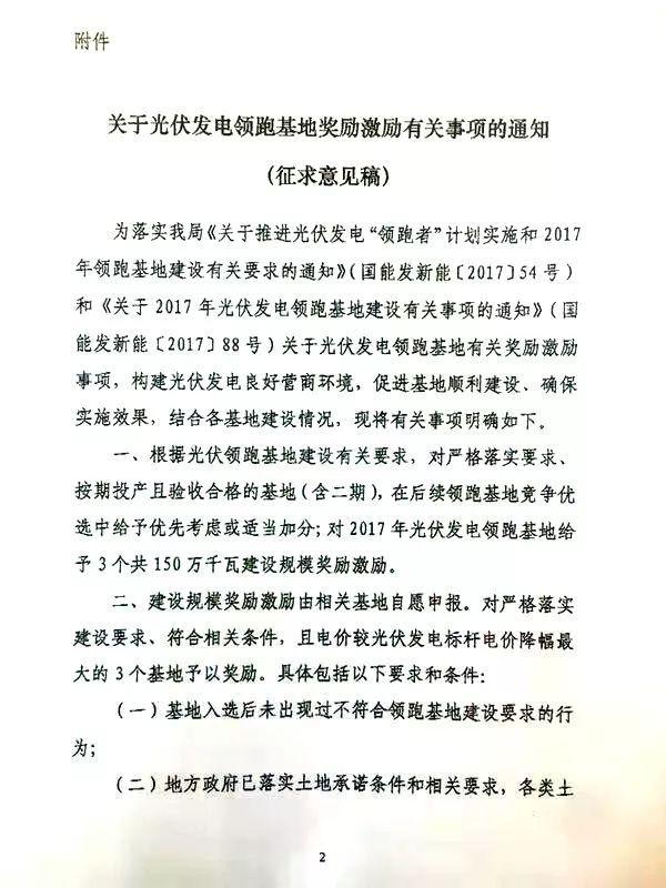 从国家能源局综合司处获悉,该局在日前印发了征求《关于光伏发电领跑基地奖励有关事项的通知》意见的函,就国能发新能【2017】54号中提出的领跑者基地奖励事宜征求相关发改委(能源局)的意见。 通知指出,根据光伏领跑基地建设有关要求,对严格落实要求、按期投产且验收合格的基地(含二期),在后续领跑基地竞争优选中给予优先考虑或适当加分;对2017年光伏发电领跑基地给予3个150万千瓦建设规模奖励激励