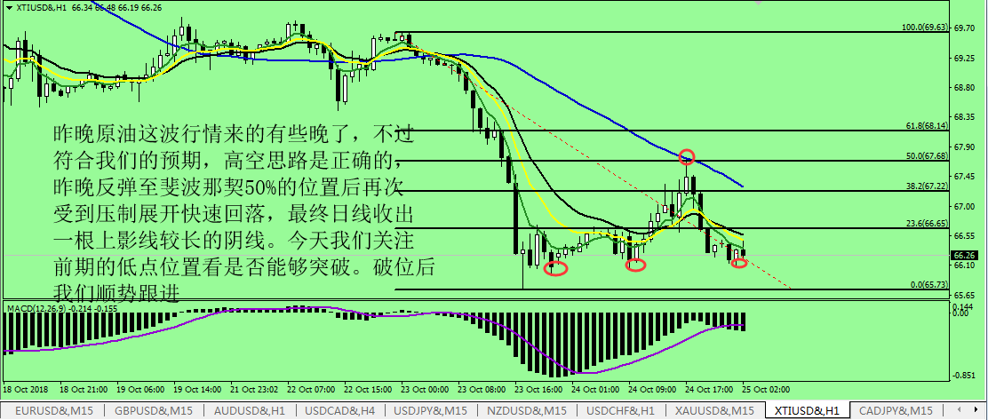 原油昨晚这波行情来的有些晚,不过还是符合我们预期的,也就是说我们高空思路是完全正确的。今日(10月25日)就我预计,原油行情基本会延续昨日EIA数据行情的方向去走,因此做空已经成为市场主流观点,在这种大的空头趋势之下,我建议还是顺势而为地好。