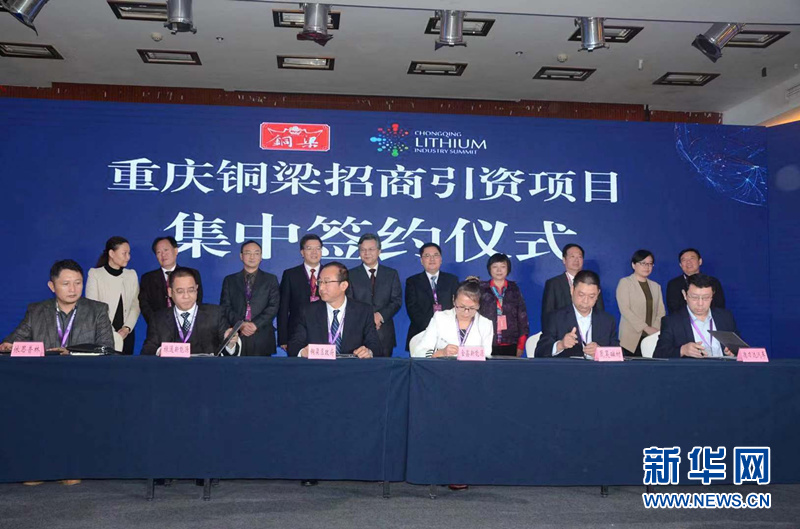 重庆市锂电产业发展资本峰会上,铜梁区与金鑫电池、晟昊磁材等13个项目签订合作协议。新华网发(铜梁宣传部供图)