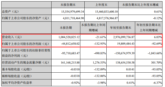 10月28日晚间,科陆电子发布三季报,公司前三季度实现营收29.76亿元,同比增长6.03%,实现归属于上市公司股东的净利润0.20亿元,同比下降92.69%,其中第三季度实现营收10.05亿元,同比下降21.61%,亏损0.45亿元,同比下降132.93%。