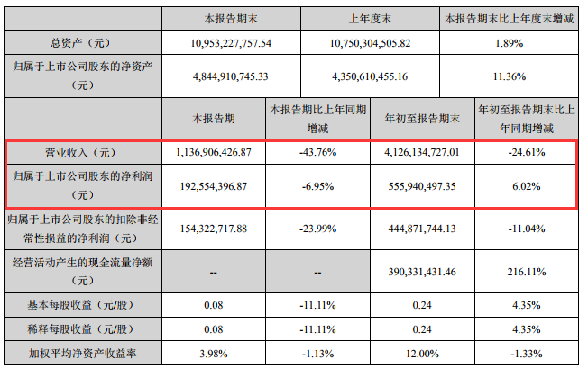 10月26日晚间,易事特发布三季报,公司前三季度实现营收41.26亿元,同比下降24.61%,实现归属于上市公司股东的净利润5.56亿元,同比增长6.02%,其中第三季度实现营收11.37亿元,同比下降43.76%,实现净利润1.93亿元,同比下降6.95%。