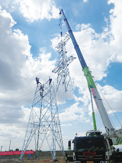 7月1日,中国能建西北电建承建的新庄风电场110千伏送出线路工程首基铁塔组立成功,标志工程取得突破性进展。新庄风电场位于陕西省定边县安边镇,规划装机规模100兆瓦,计划在今年9月20日前并网发电。 乌志文/摄