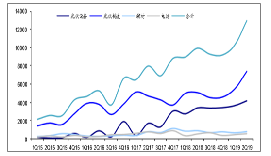 光伏板块2019年上半年期末应收账款总额达547亿元,自18年初以来呈现上升趋势,但应收账款的上升速度较2015-2017年有所放缓,相对平稳;2019年上半年末光伏板块预收账款达130亿元,呈现持续上升趋势。