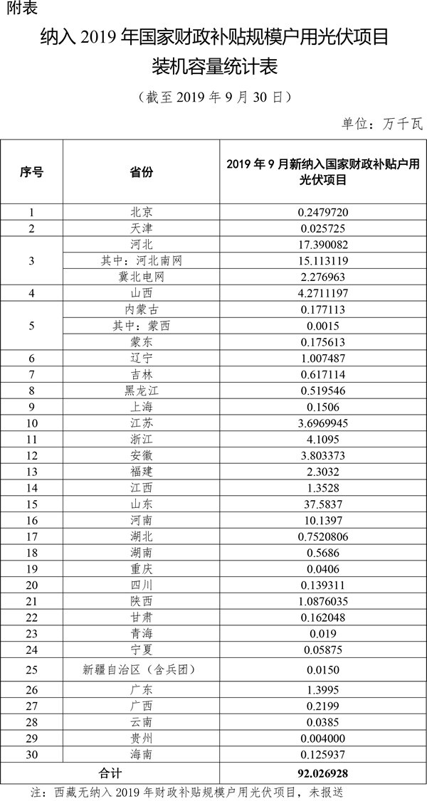 根据各省级能源主管部门、电网企业报送信息,经国家可再生能源信息管理中心梳理统计,2019年9月新纳入国家财政补贴规模户用光伏项目装机容量为92.03万千瓦。详细情况见附表。截至9月底,全国累计纳入2019年国家财政补贴规模的户用光伏项目装机容量已经超过2019年度可安排的350万千瓦新增项目年度装机总量,按照《通知》相关规定“当截至上月底的当年累计新增并网装机容量超过当年可安排的新增项目年度装机总量时,当月最后一天为本年度可享受国家补贴政策的户用光伏并网截止时间。”为保持行业均衡健