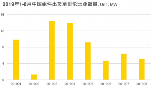 2019年1至8月份中国组件出货至哥伦比亚的数量约在65MW,总量不多,估计是满足IPP及分布式项目需求为主,考虑到近期国内已完成大型再生能源项目的招标,组件拉货需求可能会在明年开始体现,2020年整体的出货表现估计将比今年来的强劲。