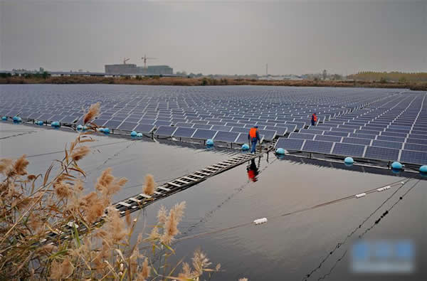 11月13日,工人在临西县灵溪湖水上光伏发电场巡查。