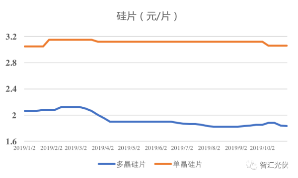 2019年,单晶硅片的供应一直相对紧张,在电池片、组件价格大幅下降的同时,单晶硅片价格坚挺,如下图所示。