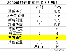 上述表格是我汇总的明年硅料产能和预期产出,明年有新产能释放的企业为新疆协鑫2万吨技改提升、东方希望5万吨五彩池二期项目。这里对明年产业格局会有重大潜在影响的企业是东方希望,倘若它明年5万吨产能顺利释放且品质能满足单晶硅片使用需求,那么总体产能还略显过剩;反之则产能不足。