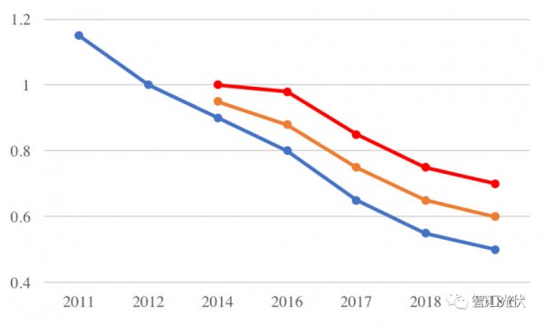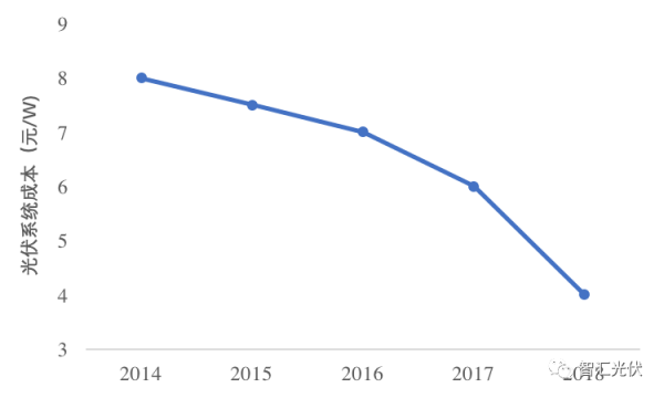 2014年~2018年,光伏系统造价仍然持续降低,但下降速度明显低于2008~2013年,具体如下图所示。