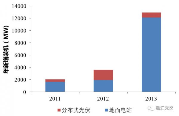 明确的电价政策,让业主有了明确的收益预期,大大激发了企业的投资积极性。2011当年,新增装机就达到2GW,同比增长300%,中国的光伏电站正式进入GW级时代。2013年,年新增装机甚至达到了近13GW。