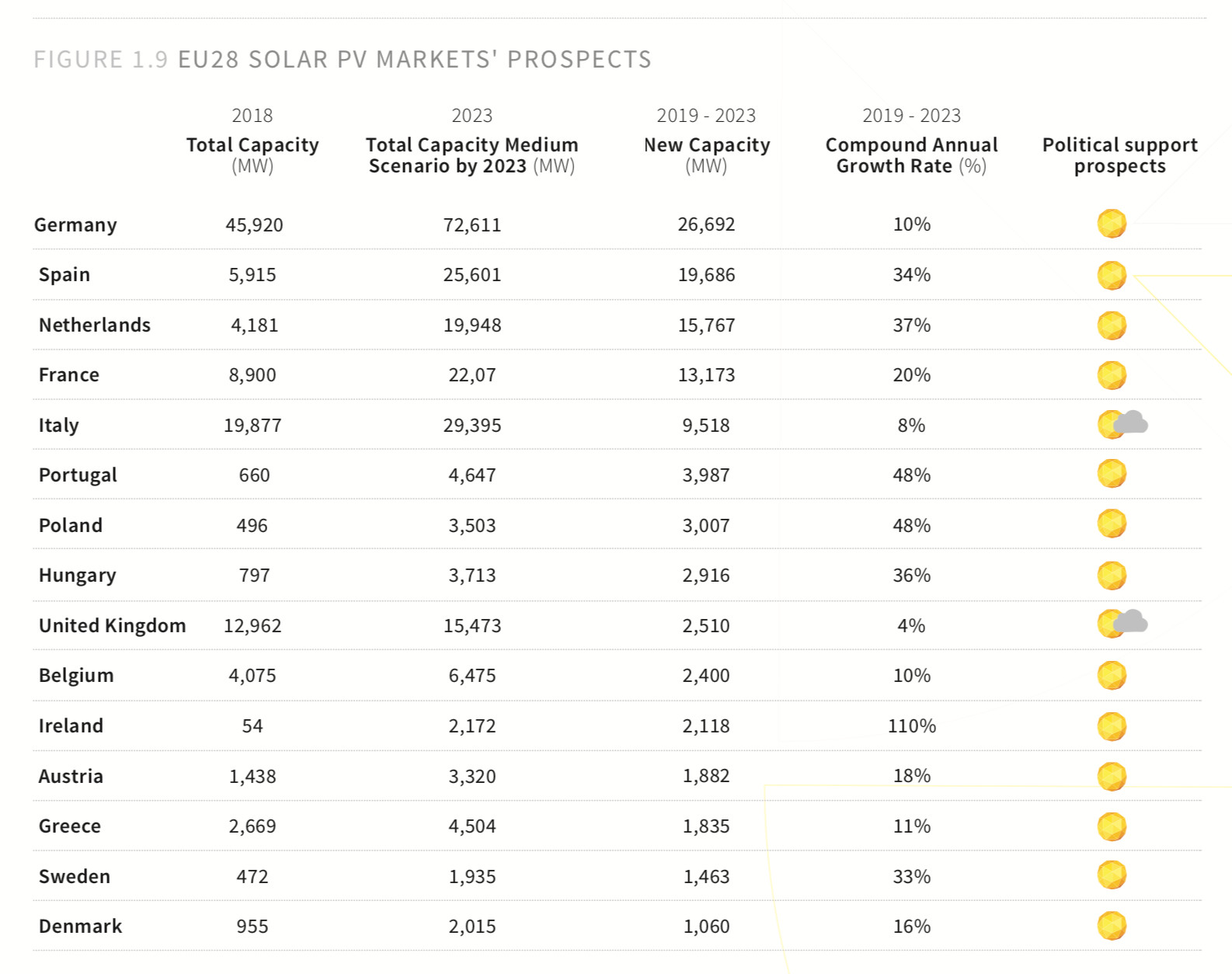 欧洲出现新的太阳能大跃进的原因关键是光伏的市场竞争力,光伏比当今任何其他发电来源都便宜,而且这种趋势仍在持续。欧盟太阳能增长的另外的主要因素是成员国在接近其约束力的最后期限完成2020年国家可再生能源目标。并为2030年实现清洁能源计划中32%的可再生能源目标做准备。