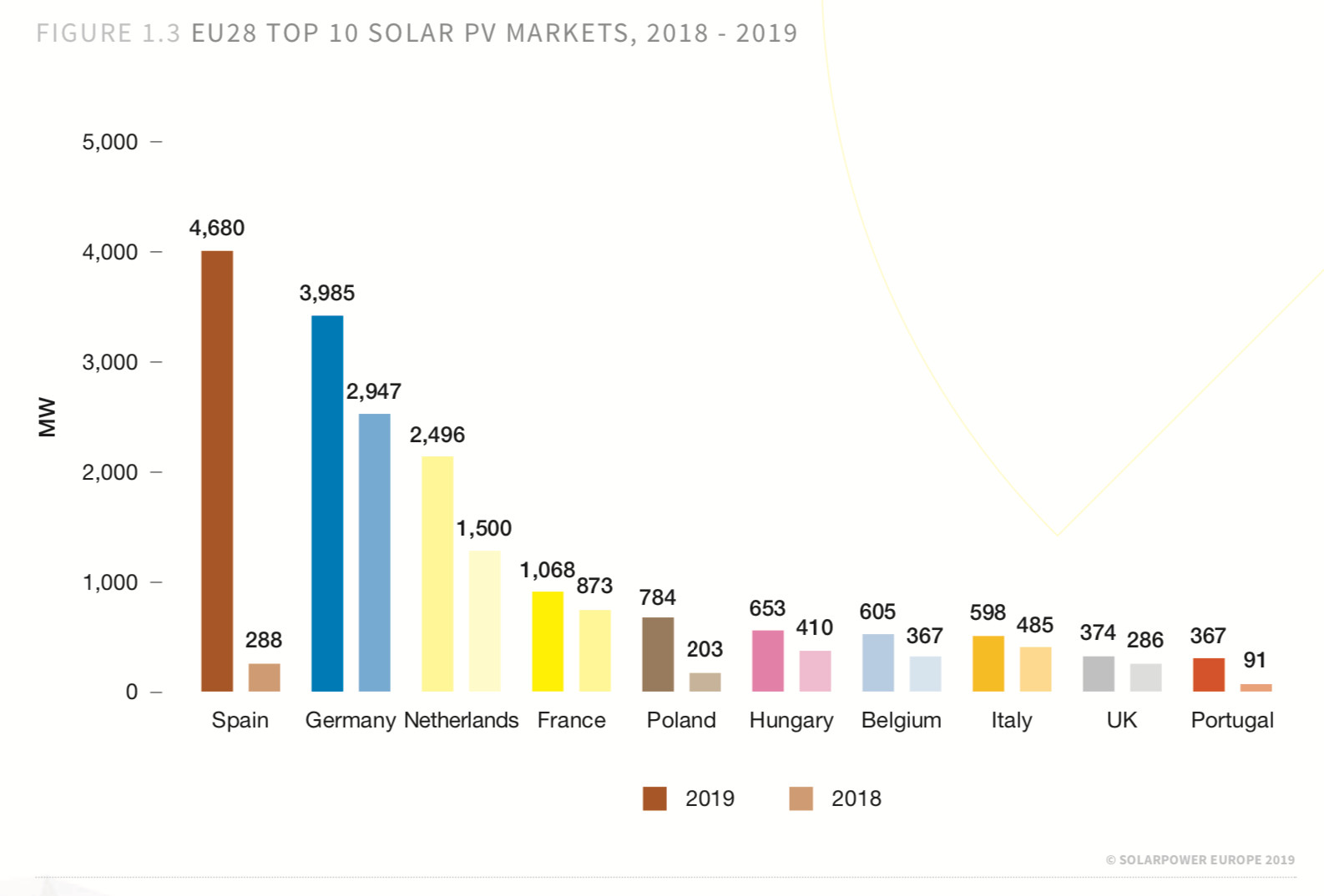 根据SolarPowerEurope的数据,2019年是欧盟太阳能光伏发展最好的一年,新增装机16.7吉瓦,增幅达到104%(2018年新增装机8.2吉瓦)。上一次欧盟光伏的增幅纪录是2010年,当时增加。此外,2019年的太阳能增长达到104%(新增装机13.4吉瓦)。西班牙在2019年增加了4.7吉瓦的装机量,是欧盟最大的太阳能市场,其次是德国(+4吉瓦),荷兰(+2.5吉瓦),法国(+1.1吉瓦)以及令许多人惊讶的波兰(2019年装机容量翻了两番,达到784兆瓦)。到2019年底,欧盟光伏累计装机达