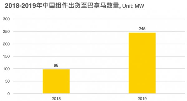 2019全年,自中国出货至巴拿马的组件数量达到245MW,和2018年总出货量98MW相比成长1.5倍,2019年出货量甚高的原因估计多半是为满足大型IPP项目需在2020年并网故提前拉货做准备。