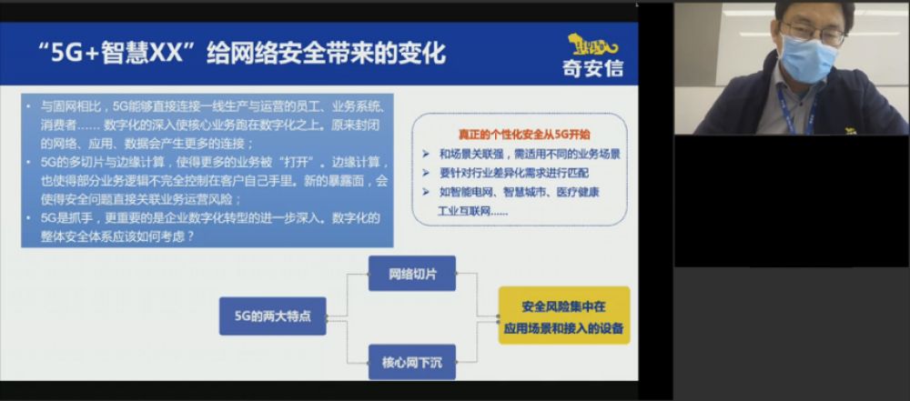 从疫情防控到复工复产,国人首次大范围感受到5G+多种新兴技术所带来的社会效率提升,面对随之而来的新型安全风险,该如何做到未雨绸缪?3月17日,国内最大的网络安全公司奇安信集团举办了一场《“5G+宽带”环境下的新基建网络安全建设解读》直播分享会,来自华北电力大学能源电力大数据研究院院长李建彬、奇安信集团副总裁韩永刚、奇安信集团副总裁左英男等专家,和运营商、能源、交通、制造业等重点行业客户一起,共同探讨在新基建下5G面临的网络安全挑战及应对之策。