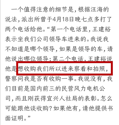 还有一种说法,王建裕在面对警察盘问时,说过“想进行收购,所以进来察看和拍照”之类的话,这句话挺重要,如果没有要收购,那就是对警察说了谎。