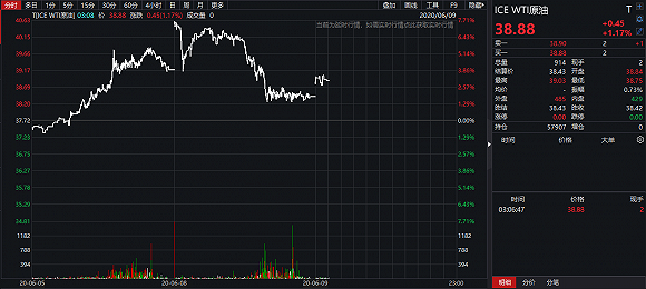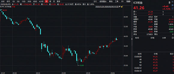 2020年6月8日,美布两油双双突破40美元,WTI原油期货一度突破40美元/桶,最高至40.63美元/桶,创下3月6日以来新高;布伦特原油期货最高报43.41美元/每桶。